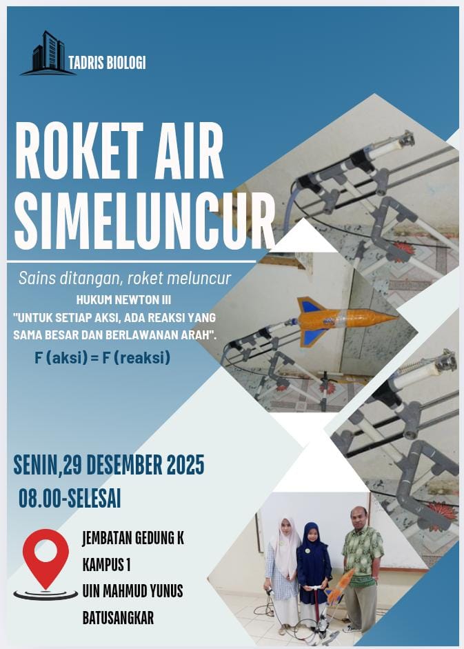 Batusangkar — 29 Desember 2025_Prodi Biologi Fakultas Tarbiyah dan Ilmu Keguruan Universitas Islam Negeri Mahmud Yunus Batusangkar, kembali melaksanakan pembelajaran yang menarik melalui pameran roket air yang diselenggarakan di kampus 1 UIN Mahmud Yunus Batusangkar pada 29 Desember 2025 bersama Dr. Frans Rizal Agustiyanti, S.Si, M.Si., selaku dosen pembimbing mata kuliah Fisika pada prodi Biologi. Pembelajaran sains yang menyenangkan kembali diwujudkan melalui kegiatan Simeluncur (Sains Meluncur) dengan praktik pembuatan dan peluncuran roket air. Kegiatan ini menjadi wadah edukatif yang menggabungkan konsep teori dan praktik secara langsung, sehingga sains benar-benar “hidup” di tangan peserta. Dalam kegiatan tersebut, peserta diperkenalkan pada konsep dasar fisika, seperti tekanan udara, gaya dorong, dan hukum aksi–reaksi. Melalui roket air sederhana yang dirancang dari bahan-bahan mudah ditemukan, peserta diajak memahami bahwa sains tidak hanya sebatas rumus di kelas, tetapi juga dapat diaplikasikan secara nyata dan menyenangkan.