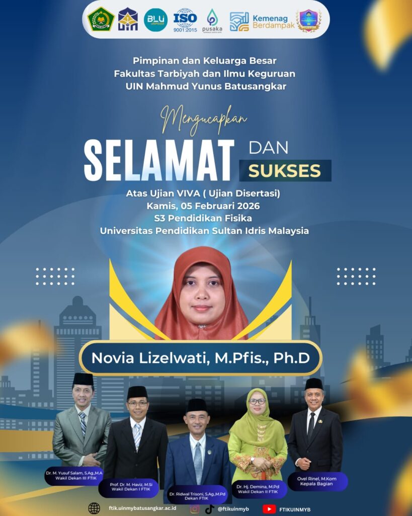 Ujian VIVA/Ujian Akhir Disertasi tersebut dilaksanakan pada Kamis, 5 Februari 2026 di Universitas Pendidikan Sultan Idris (UPSI), Malaysia, dan dinyatakan lulus dengan hasil yang sangat memuaskan. Keberhasilan ini menjadi kontribusi strategis bagi FTIK dalam memperkuat kualitas sumber daya dosen, khususnya pada bidang pendidikan sains dan fisika