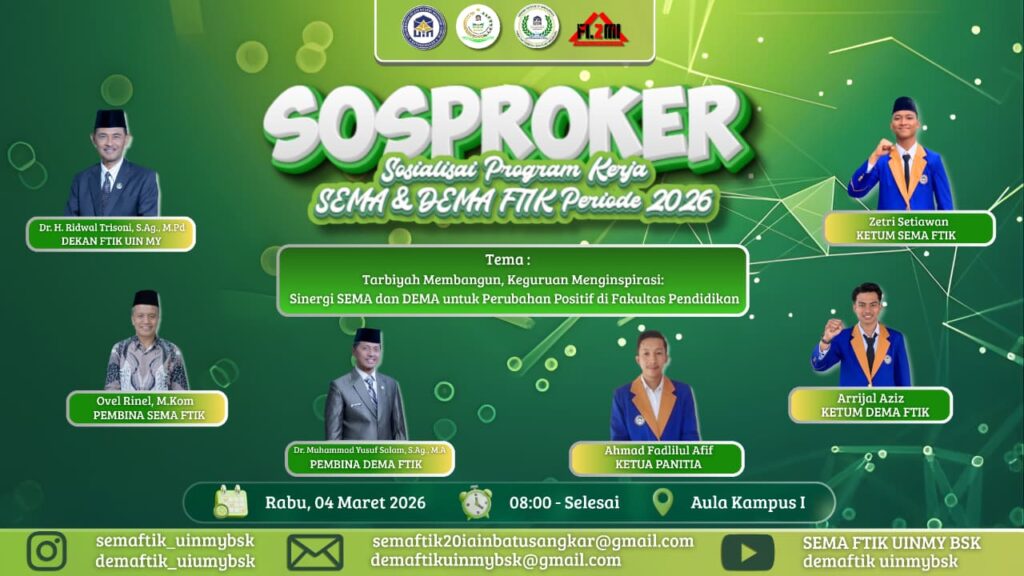 Batusangkar, 04 Maret 2026_ Fakultas Tarbiyah dan Ilmu Keguruan (FTIK) UIN Mahmud Yunus, Batusangkar, secara resmi membuka seri sosialisasi program kerja Senat Mahasiswa (SEMA) dan Dewan Eksekutif Mahasiswa (DEMA) untuk tahun 2026. Konferensi dengan tema “Tarbiyah membangun, Keguruan menginspirasi: Sinergi SEMA dan DEMA untuk Perubahan Positif di Fakultas Pendidikan” menjadi momentum penting untuk menekankan peran strategis organisasi mahasiswa di lingkungan akademik.